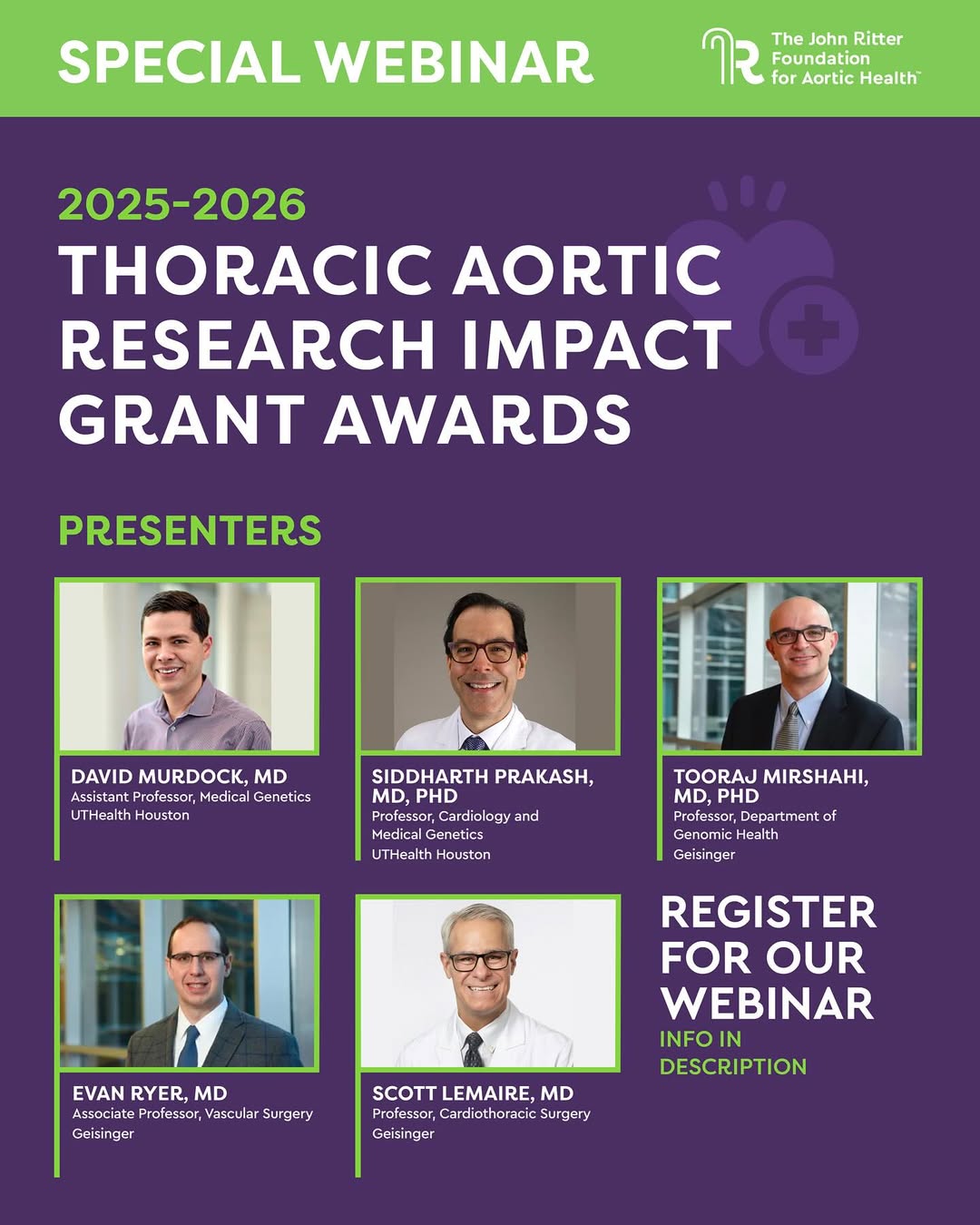 Join us for a special webinar as we announce the recipients of The John Ritter Foundation’s 2025–2026 Thoracic Aortic Research Impact Grants. These grants represent our ongoing commitment to advancing research that improves the diagnosis, treatment, and prevention of heritable thoracic aortic disease. During this event, you’ll hear directly from the two research teams selected for funding as they share their project goals and the potential impact of their work. Whether you’re a patient, family member, clinician, or researcher, this webinar is an inspiring opportunity to see how your support fuels life-saving research.